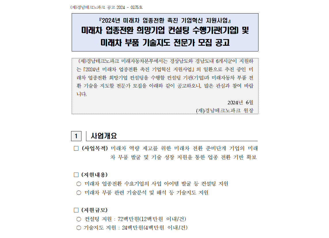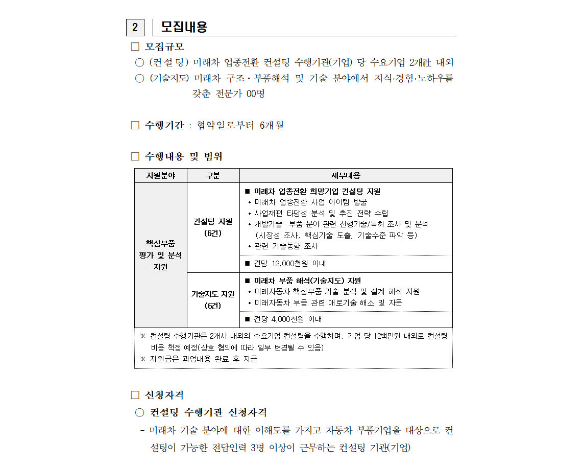 | 2024년 미래차 업종전환 희망기업 컨설팅 수행기관(기업) 및 미래차 부품 기술지도 전문가 모집 공고 | |||