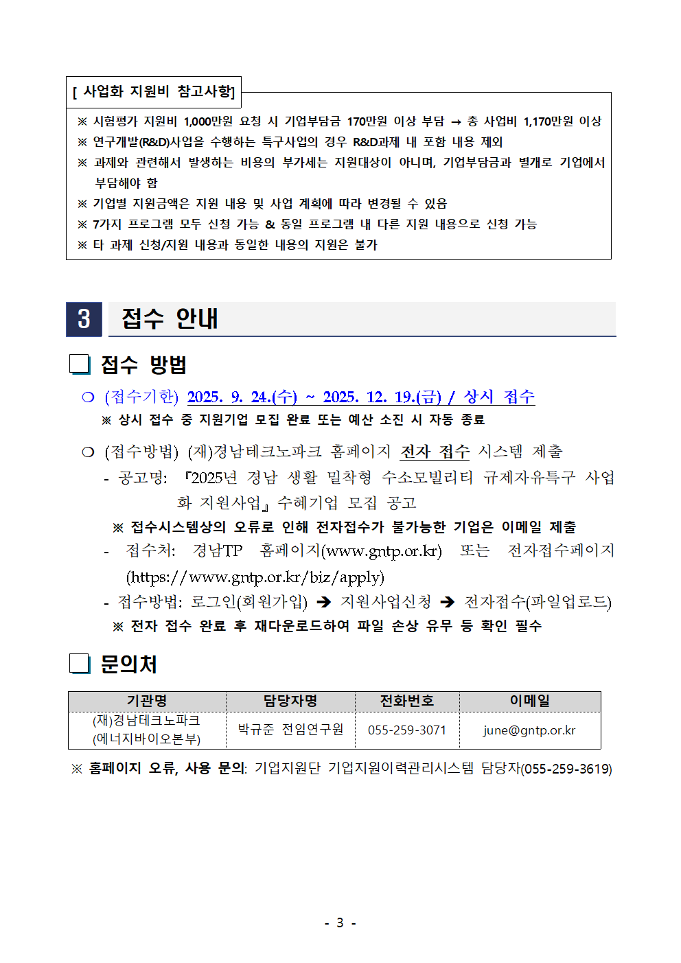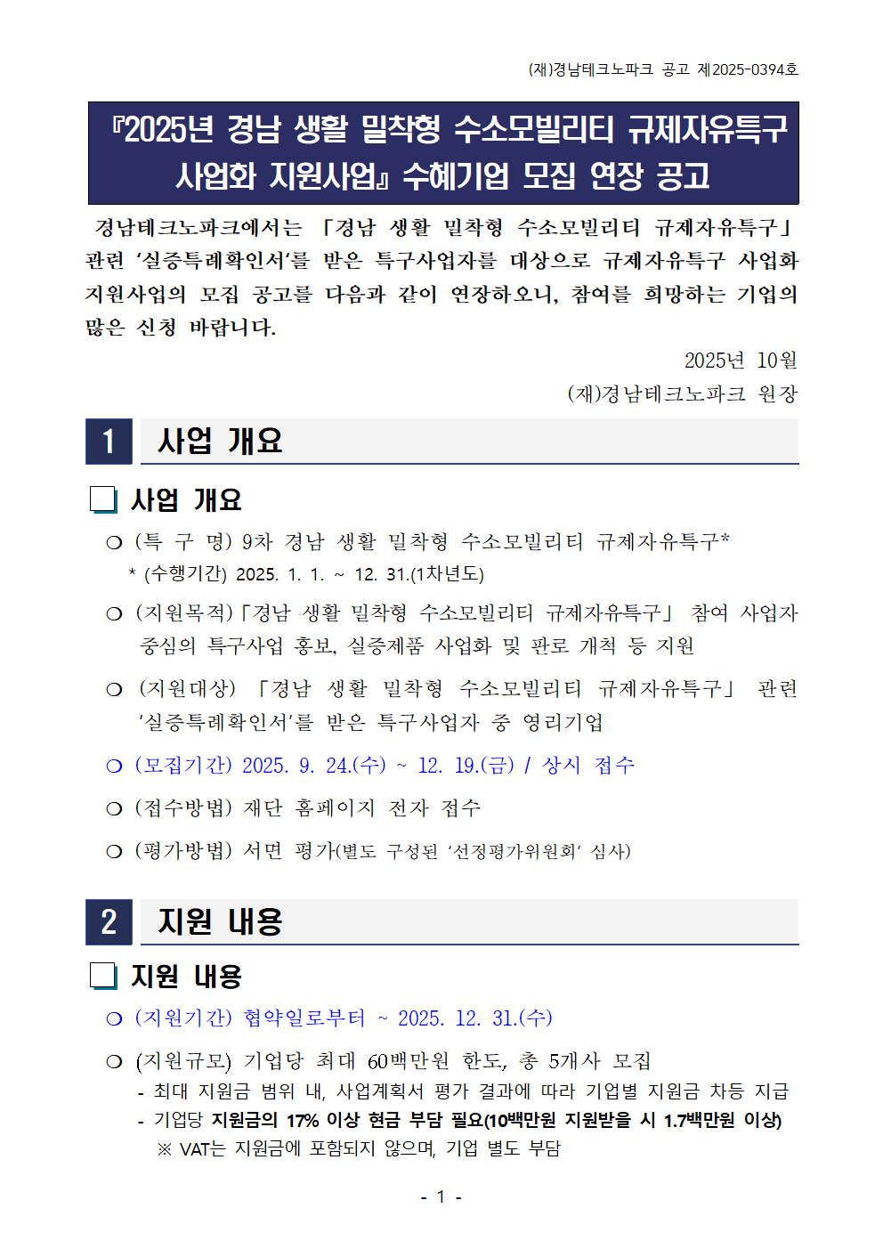 | 『2025년 경남 생활 밀착형 수소모빌리티 규제자유특구 사업화 지원사업』 수혜기업 모집 공고(연장) | |||