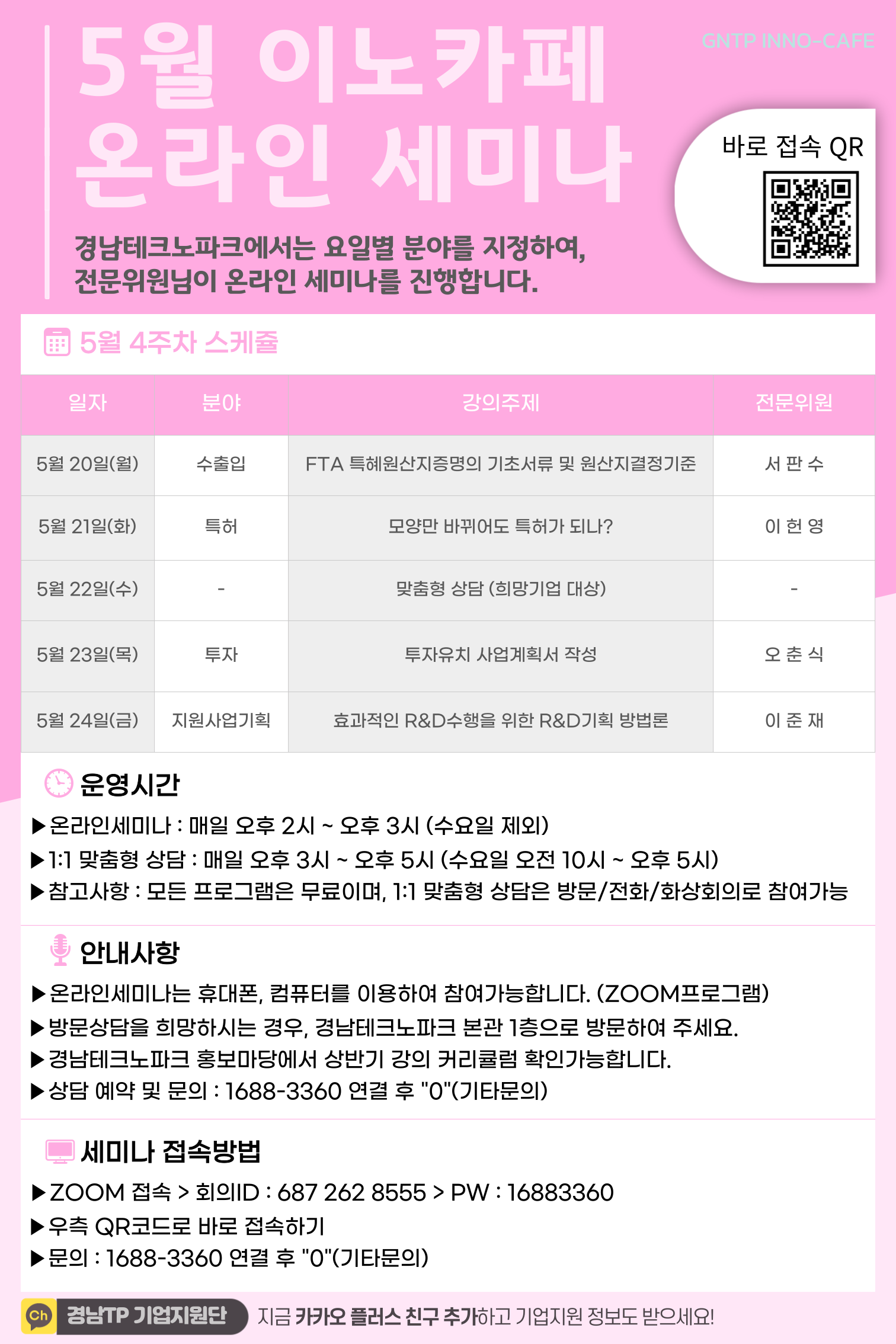 1. 온라인세미나 - 요일별 전문분야를 지정하여, 관련이슈 또는 공통애로사항을 주제로 세미나 진행 (줌 프로그램활용) - 운영시간: 매일 오후 2시~3시(수요일 제외) - 접속링크: https://zoom.us/j/6872628555?pwd=Y2hvbDRrRnU1TFNNVmpreGxFN3V3Zz09