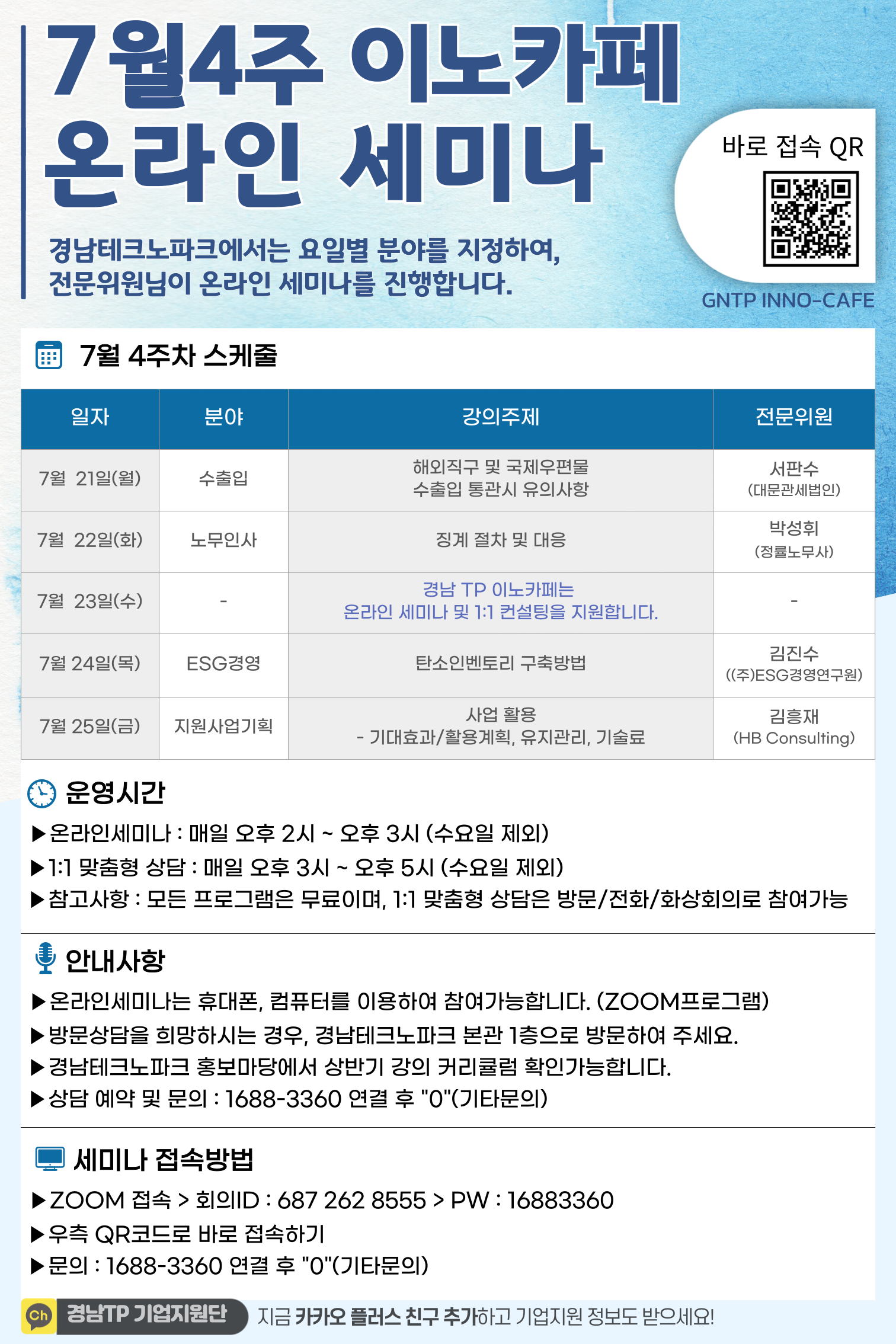 ★ 경남TP 기업지원단 카카오톡 채널을 통해 온라인세미나 일정 및 지원사업 안내를 받아보세요.